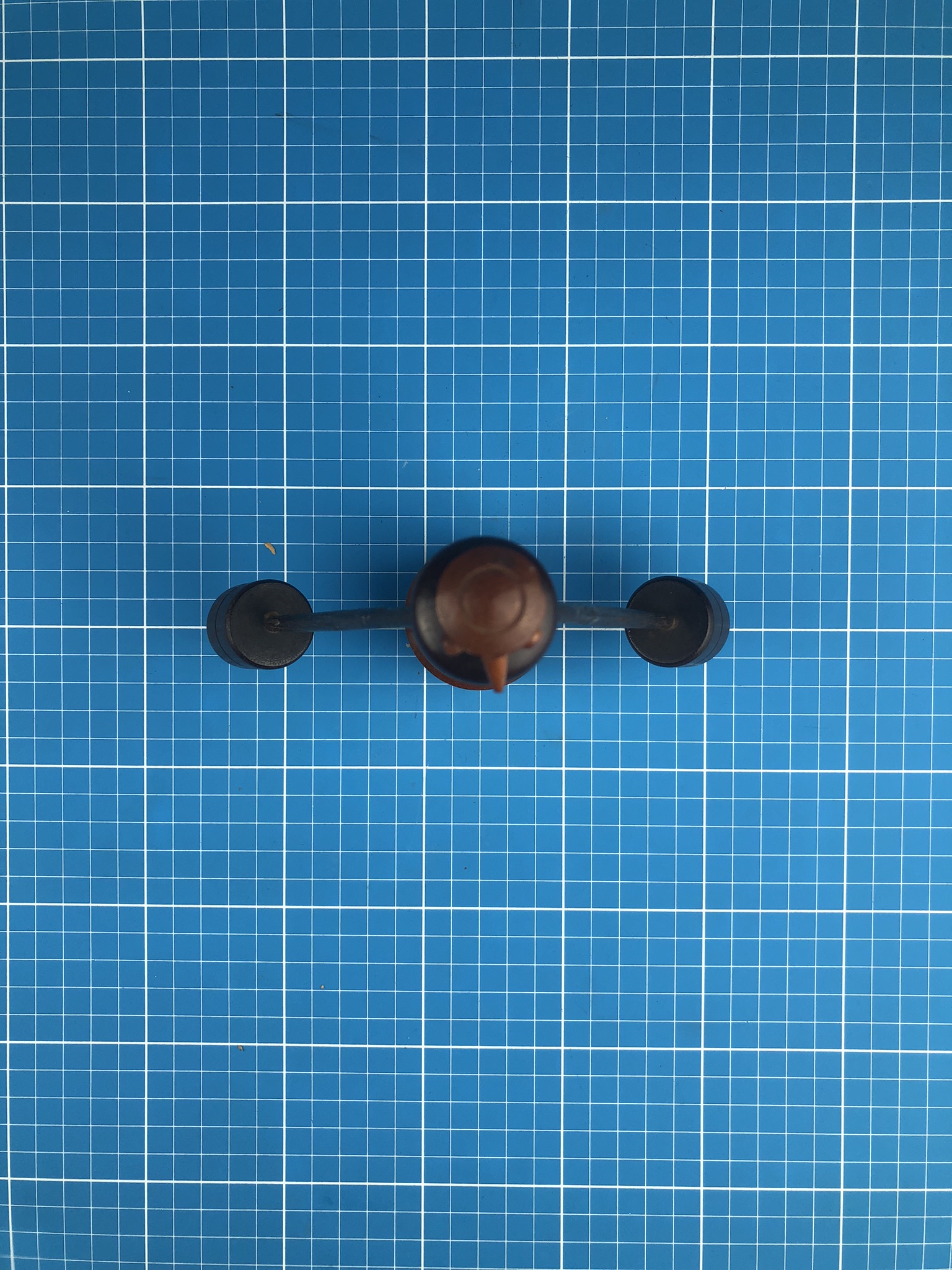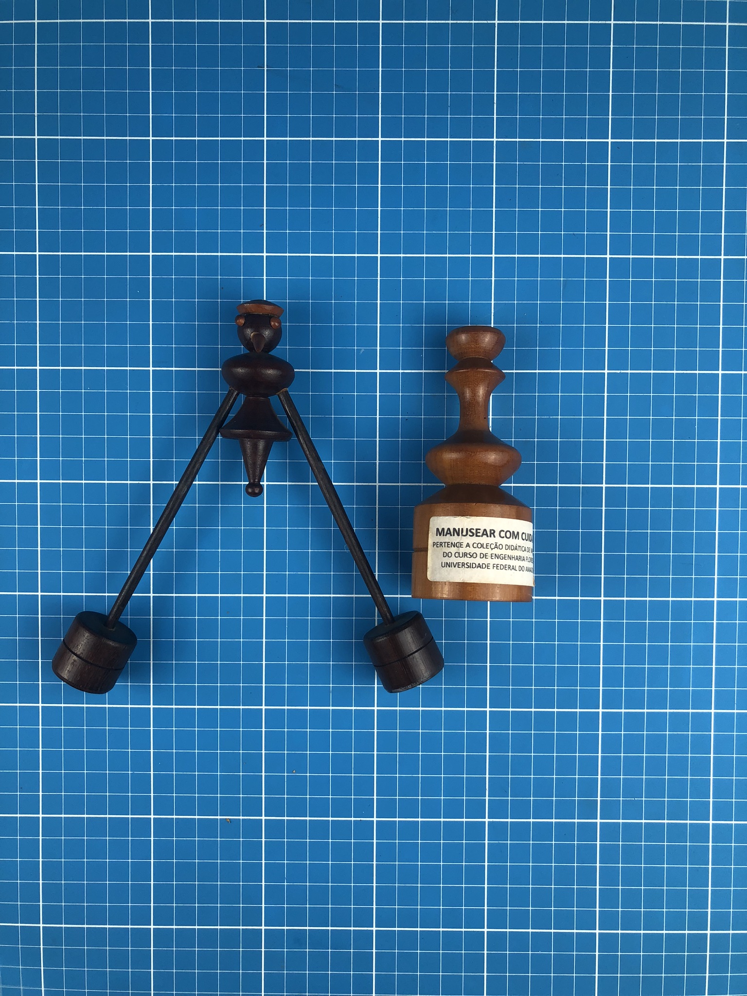 Peão esculpido em madeira, em formato que lembra um pássaro e possui uma base com o topo escavado para que o peão rode em cima da base.