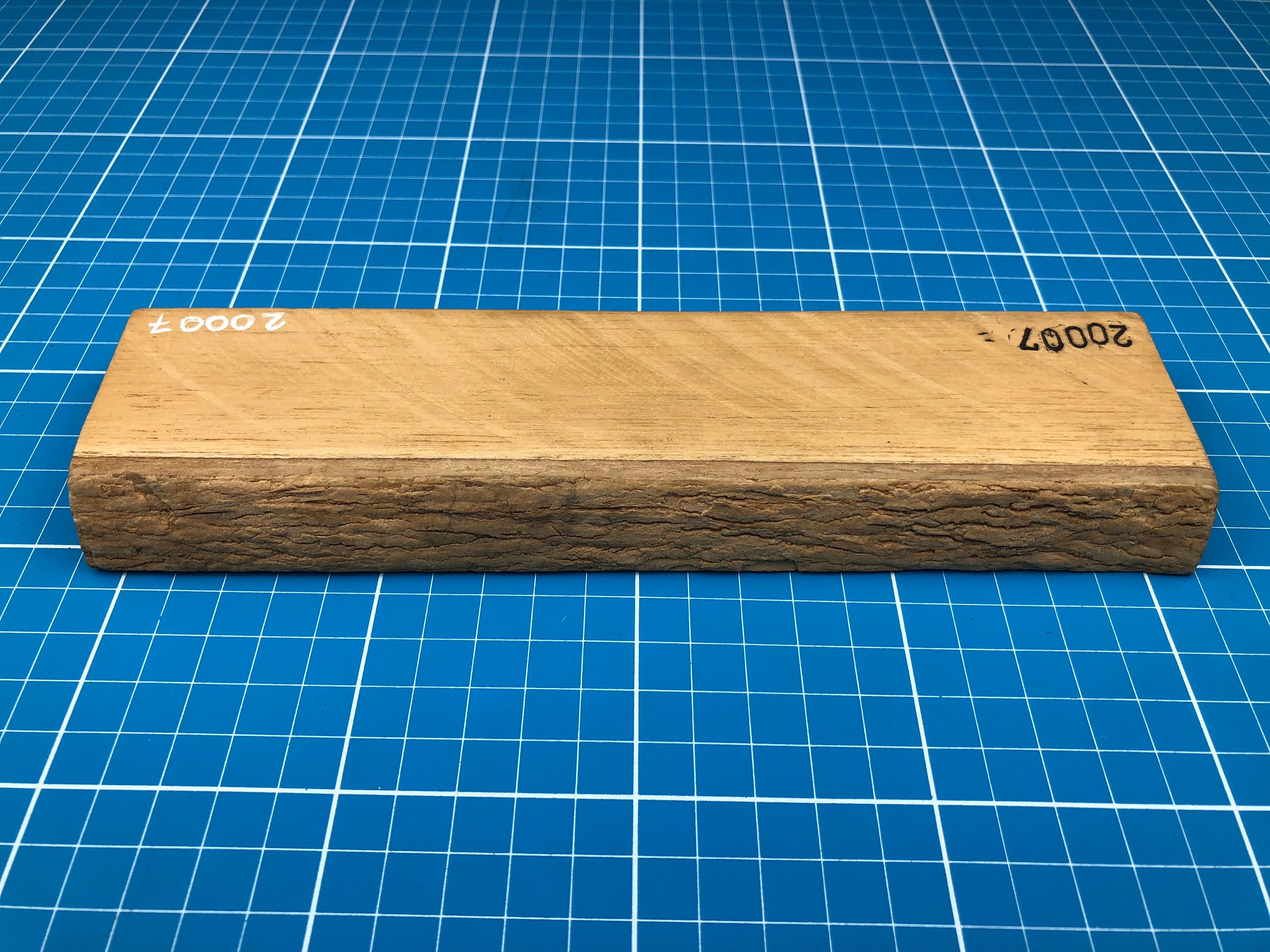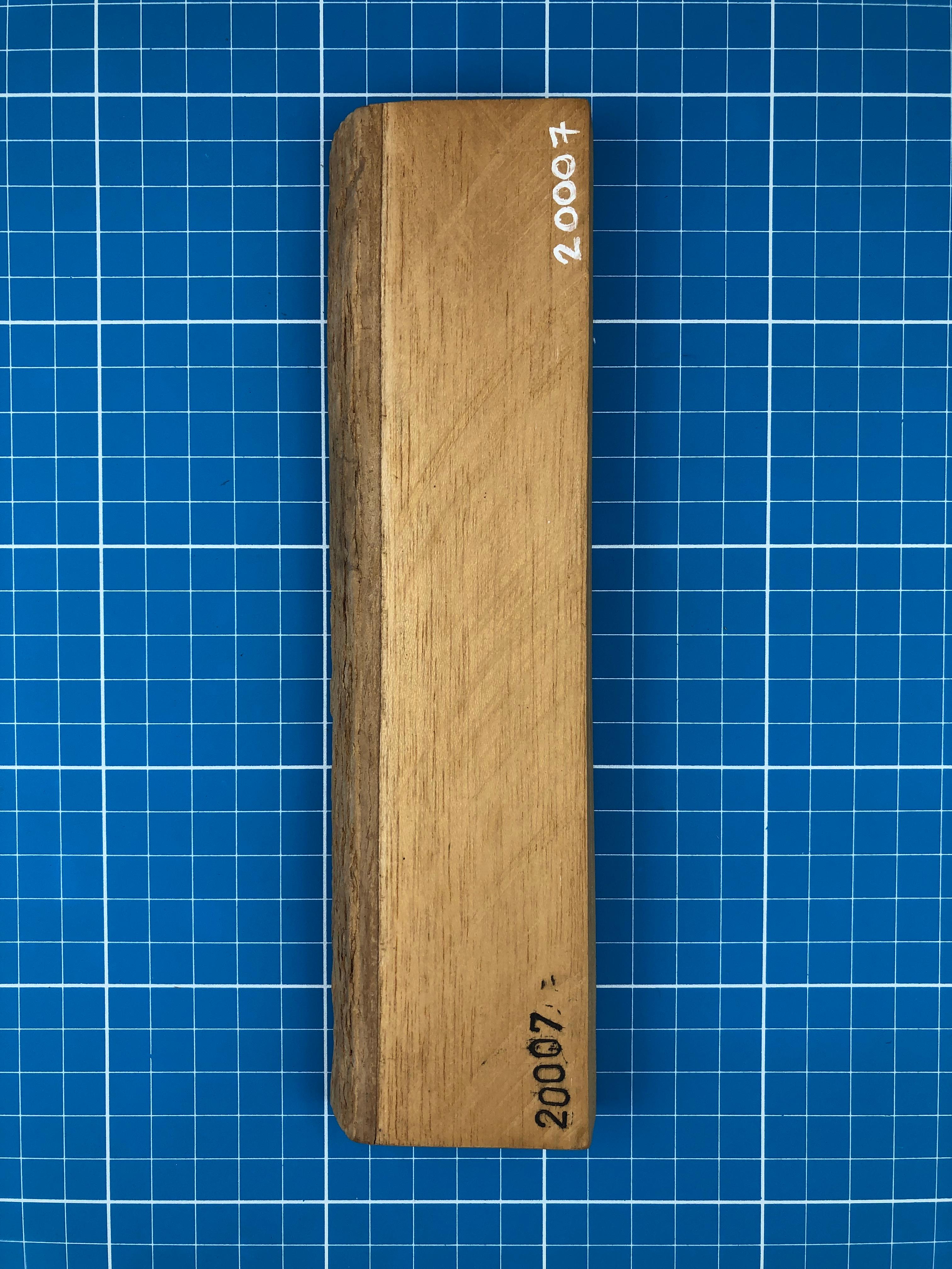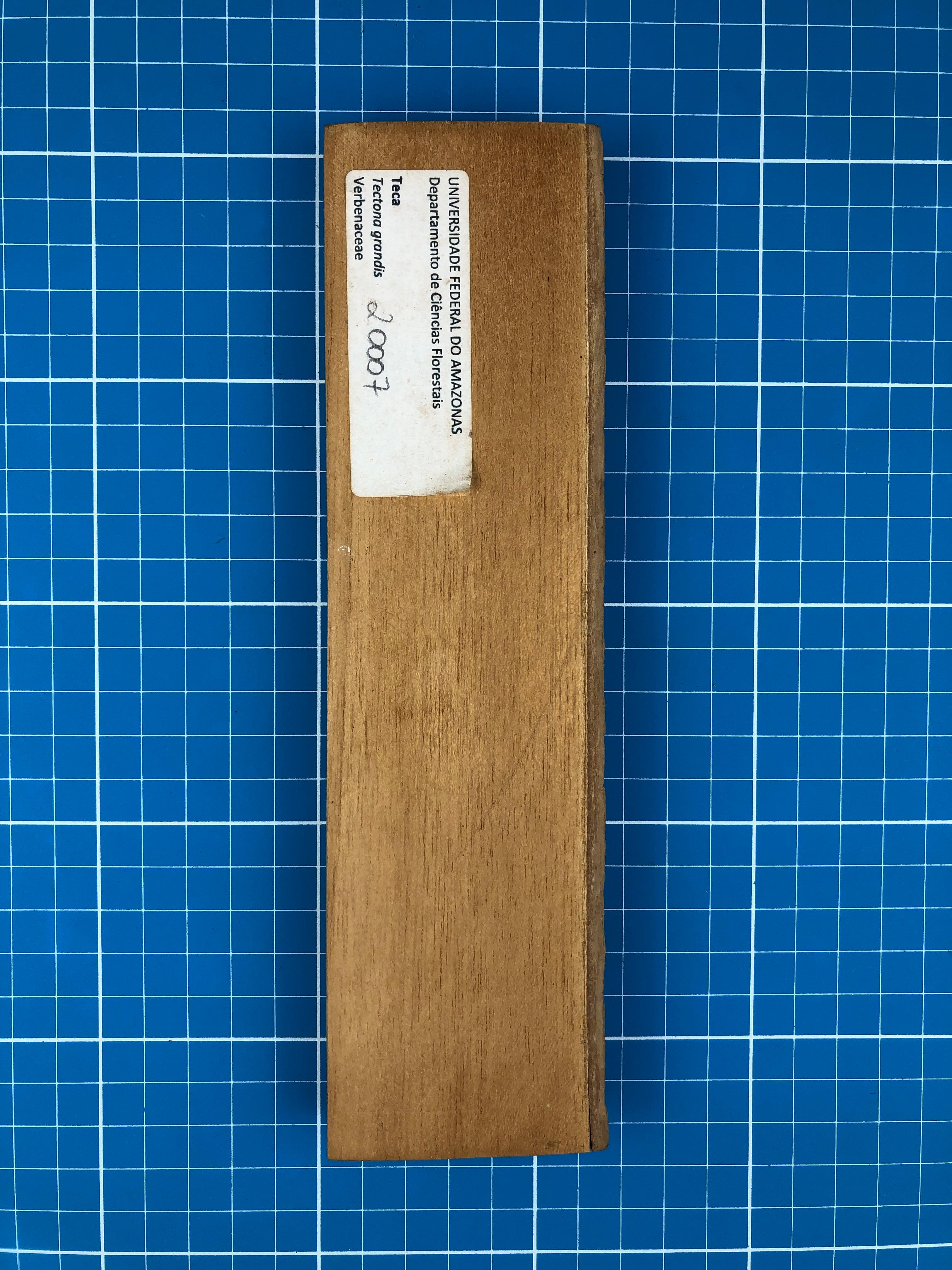 Peça de madeira de Teca em formato de ripa, contendo casca. Medidas: 22,3x6,0x2,0cm.