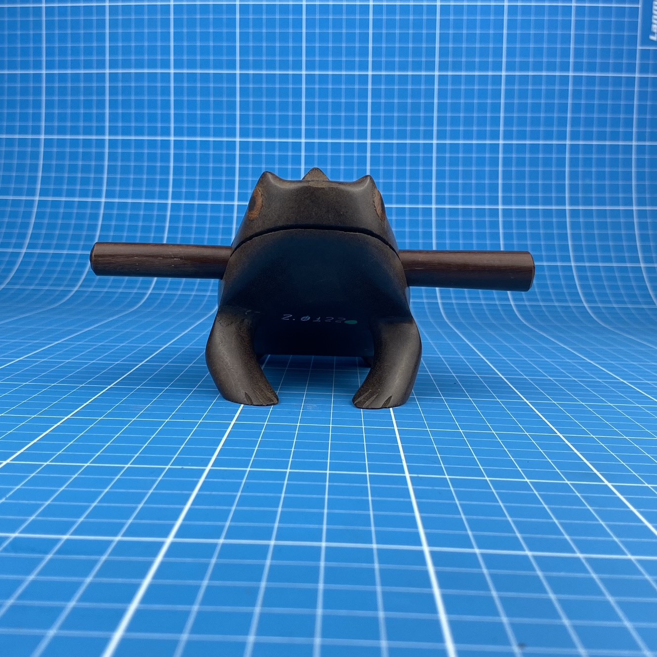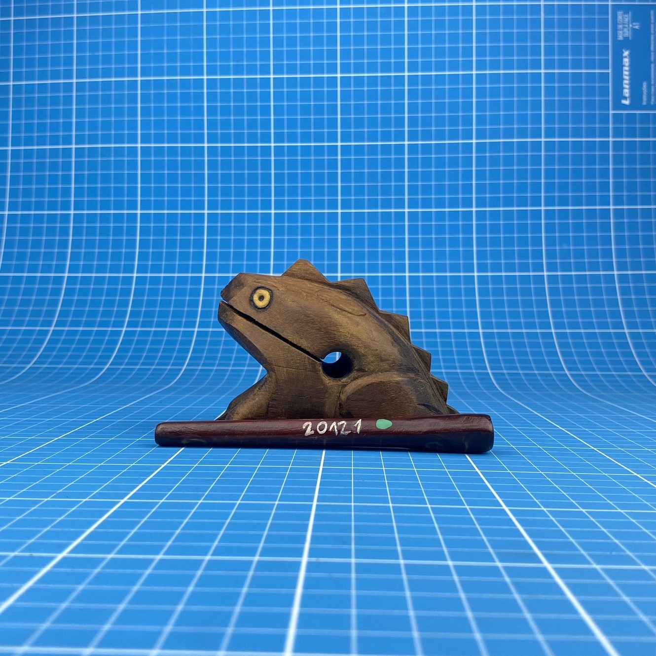 Sapo Grande esculpido em madeira, acompanha um pqueno bastão de madeira. Nas costas do sapo há pequenas elevações, que quando passa-se a haste sobre elas emitem um som que assemelha ao de sapos.