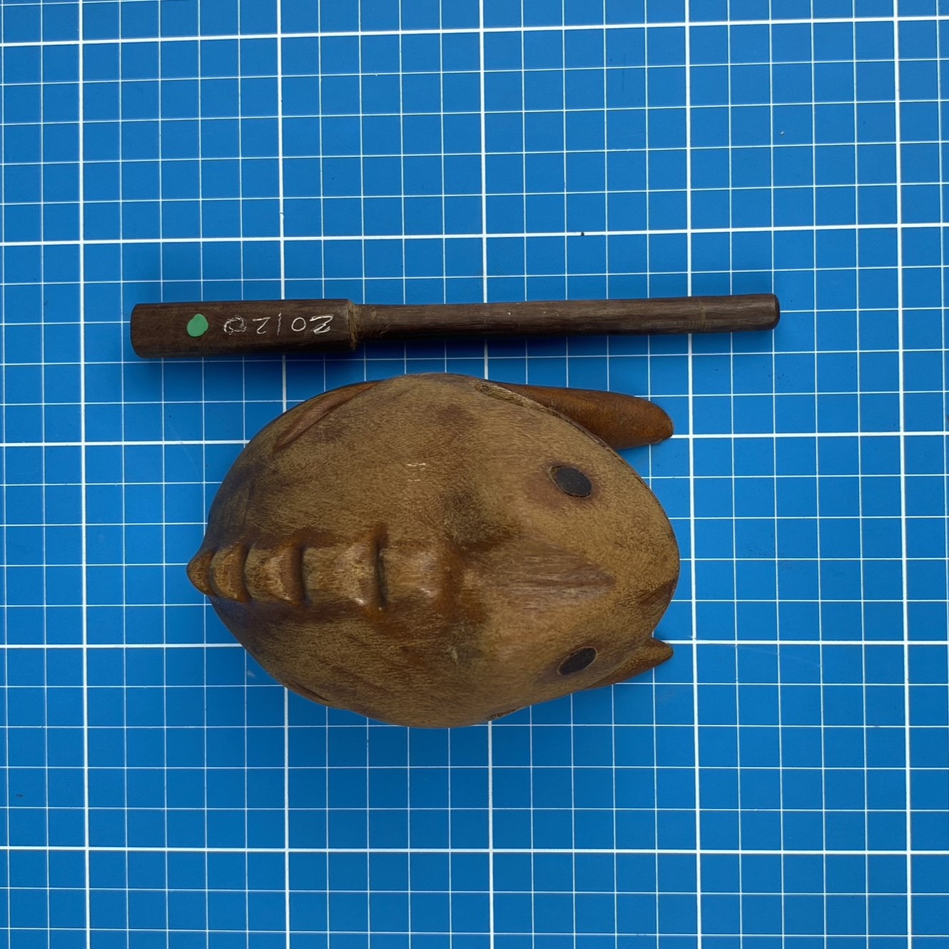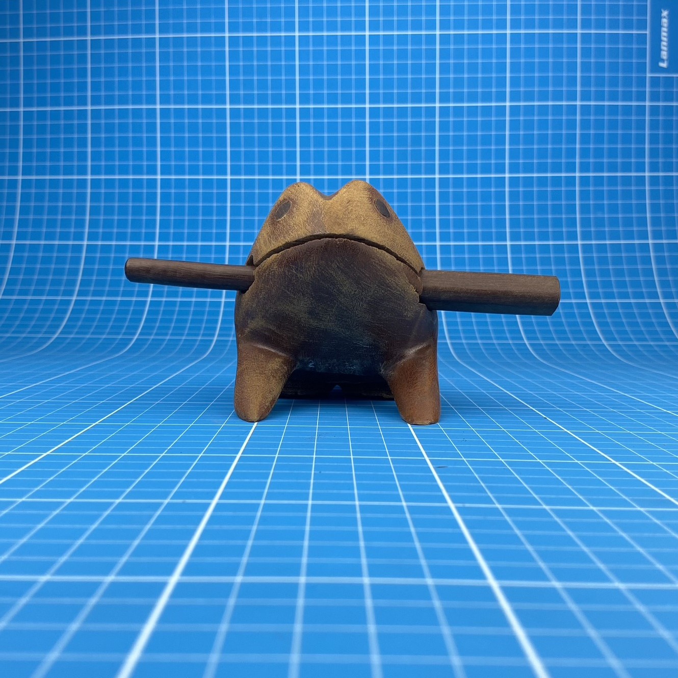 Sapo Grande esculpido em madeira, acompanha um pqueno bastão de madeira. Nas costas do sapo há pequenas elevações, que quando passa-se a haste sobre elas emitem um som que assemelha ao de sapos.